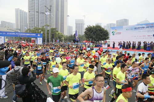 上午7:30,广东省委副书记、深圳市委书记马兴瑞,中国田协主席、全国政协教科文卫体委员会副主任段世杰,亚田联副主席Suhail ,马来西亚田协副主席Datuk Tham Sieu kai,深圳副市长吴以环,宝安区委书记黄敏,区长姚任等政府领导及华讯方舟创始人、副董事长吴光胜等赞助企业代表共同为华讯方舟?2016深圳宝安国际马拉松赛鸣枪。随着枪响,一万六千余名选手从宝安区政府南大门激情起跑,开始了最美赛道上的较量。